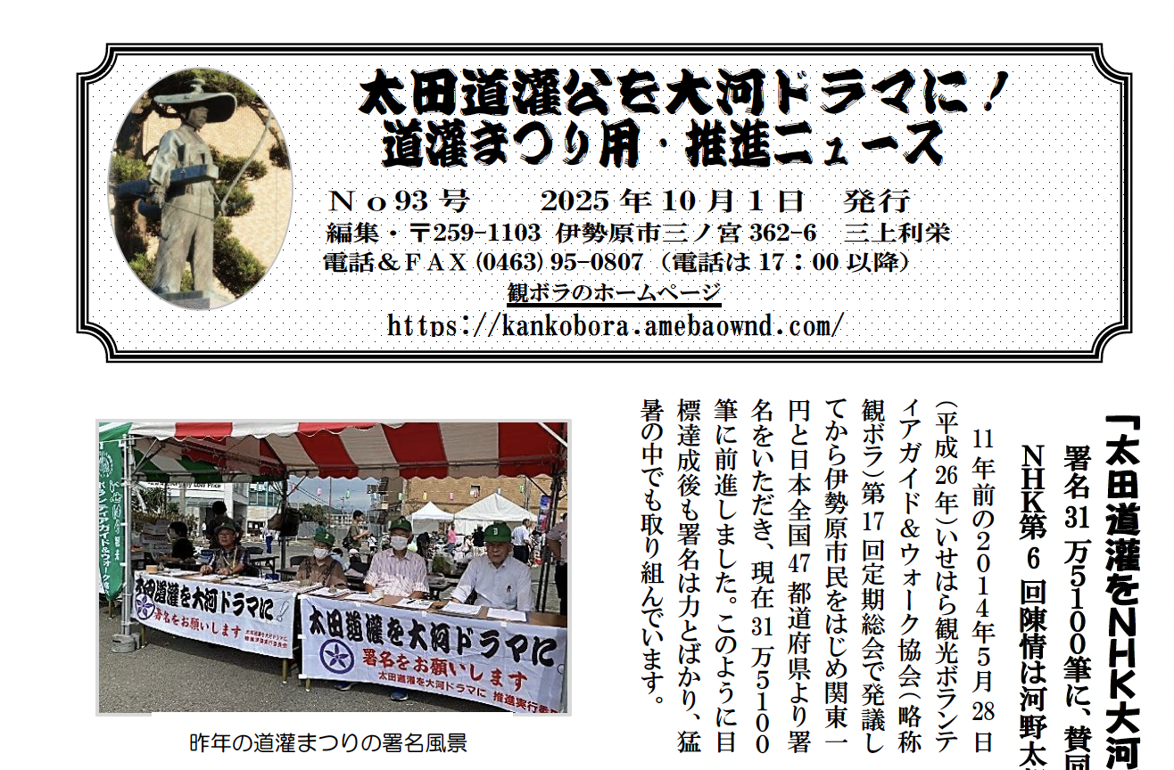 「太田道灌を大河ドラマに」の第93号ニュースが発行されました。この運動はまだまだ続けていきますのでご注目ください。